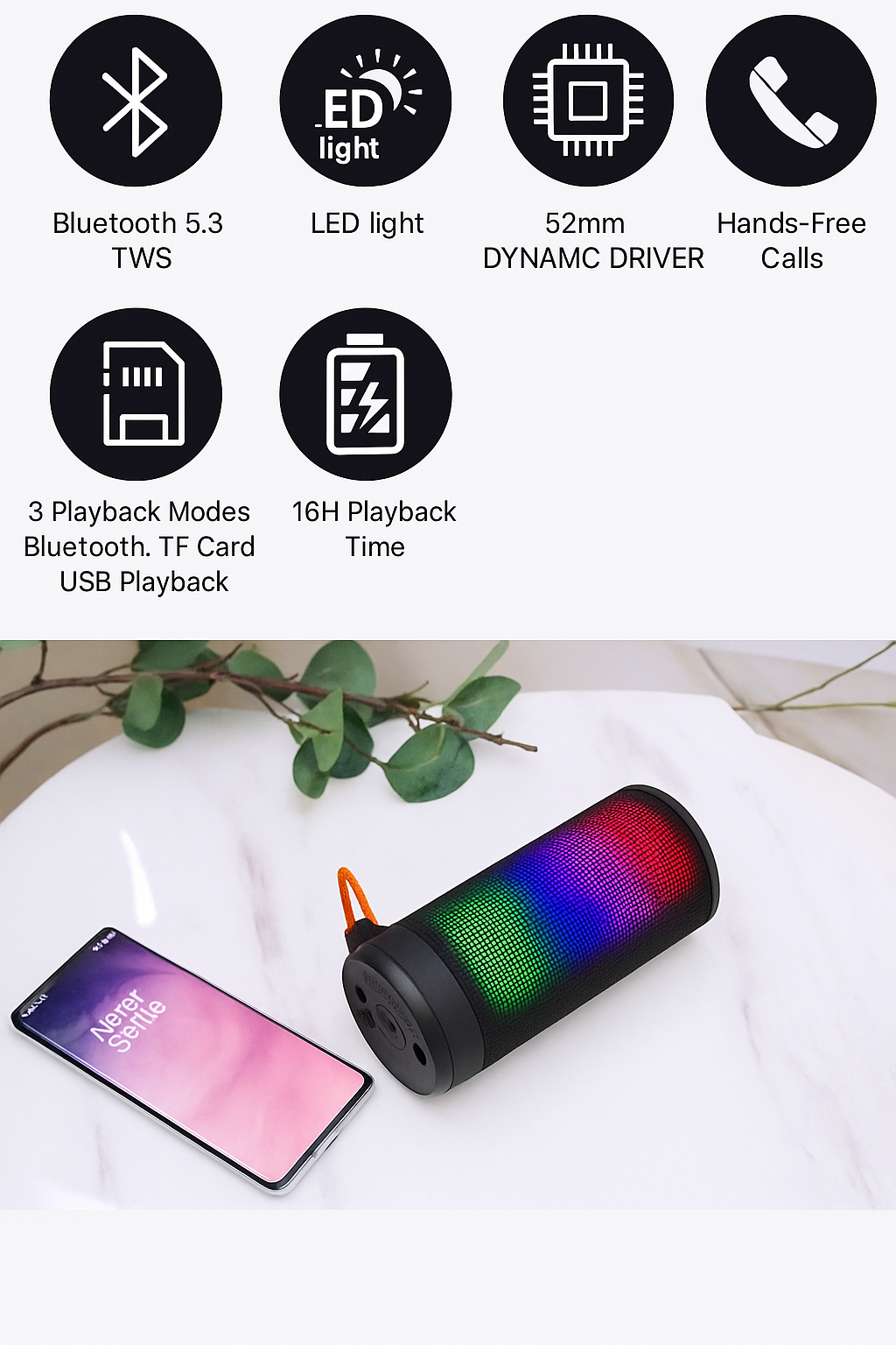 The PLEIGO BS15 is a fabric-designed Bluetooth speaker with built-in LED mood lighting, offering a sleek appearance and excellent sound quality.